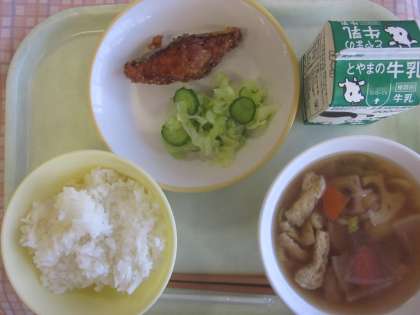 今日の献立は「ご飯、牛乳、魚の竜田揚げ、添え野菜、根菜汁」でした。