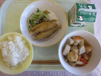 今日の献立は「ご飯、牛乳、おでん、わかさぎのフリッター、昆布和え」でした。