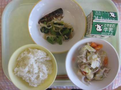 今日の献立は「ご飯、牛乳、塩麹鍋、イワシの土佐煮、おひたし」でした。