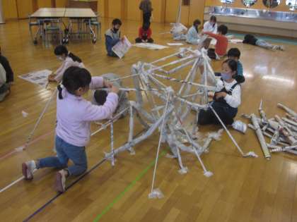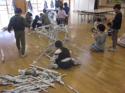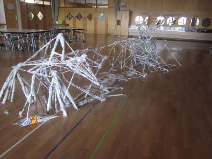 2年生です。新聞を使って、シンボルタワーをつくりました。