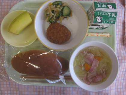 今日の献立は「コッペパン、牛乳、豆とカボチャのコロッケ、大根サラダ、キャベツスープ、棒チーズ、バナナ」でした。今週もおいしくいただきました。