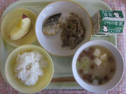 今日の献立は「ご飯、牛乳、鯖の塩焼き、茎わかめのきんぴら、なめこの味噌汁、りんご」でした。