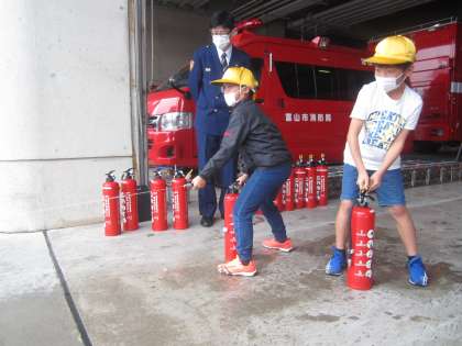 消防局では、消火器体験をしたり消防車両の説明を聞いたりしました。