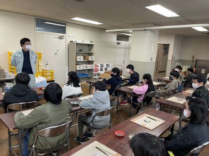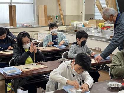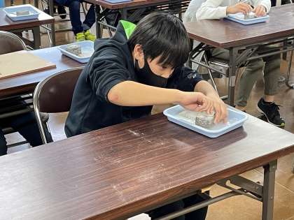 埋蔵文化財センターで火おこしや勾玉づくりを体験しました。