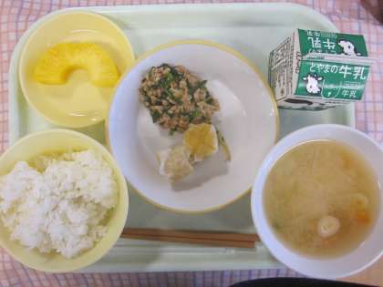 今日の献立は「ご飯、牛乳、人参シューマイ、スタミナ納豆、具だくさん汁、カットパイン」でした。
