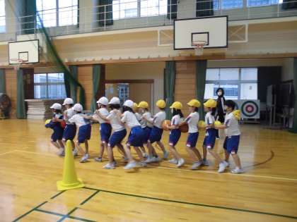 ボールを使って、いろいろな動きに挑戦しています。体の間にボールをはさんで進んだり、ボールを高く上げて拍手をしたりしました。ボールと仲良くなれるように練習しています。
