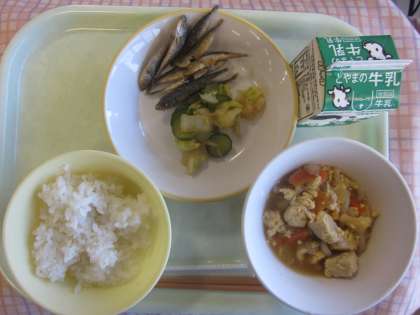 今日の献立は「ご飯、牛乳、親子煮、小アジの唐揚げ、白菜ひたし」でした。