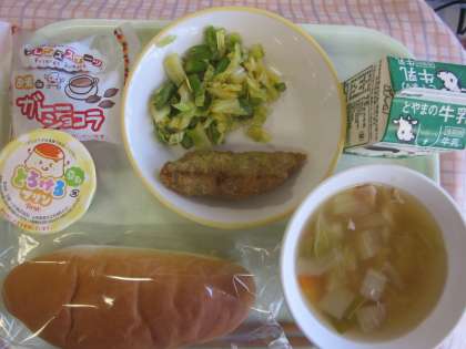 今日は選択献立でした。「コッペパン、牛乳、アスパラサラダ、ひよこ豆のスープ、」ここまで共通です。