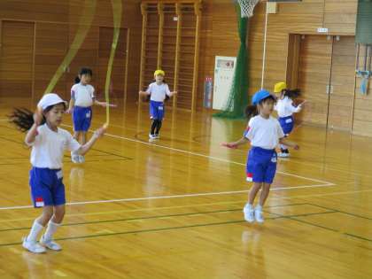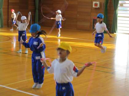 1年生は、今 縄跳びの練習をしています。前跳びや後ろ跳びがだんだんうまくなってきました。あや跳びの練習も始めましたが、まだまだ難しいようです。これから、もっともっと上手になりたいとがんばっています。