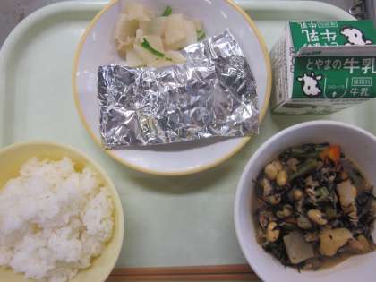 今日の献立は「ご飯、牛乳、鯖の銀紙焼き、カブの彩り、大豆の磯煮」でした。