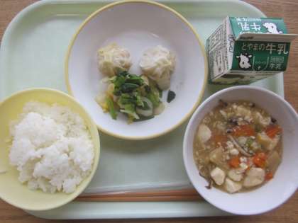 今日の献立は「ご飯、牛乳、エビと豆腐のうま煮、小籠包、小松菜ひたし」でした。