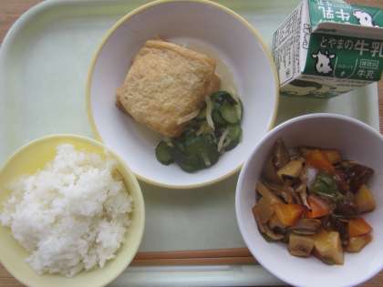 今日の献立は「ご飯、牛乳、酢豚、信田巻き、わかめサラダ」でした。