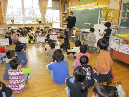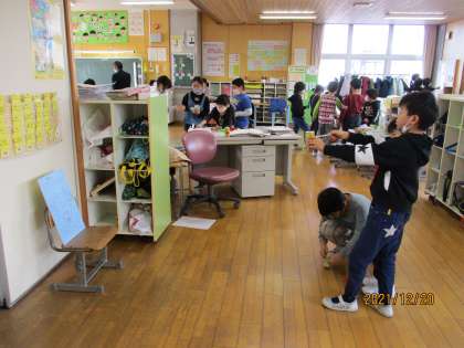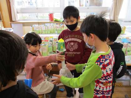 先日、1年生に動くおもちゃを披露した2年生の子供たち。今日は、2年1組と2年2組が互いに招待し合って、動くおもちゃで遊びました。それぞれのクラスの個性が光っていて、楽しい「おもちゃランド」になりました。