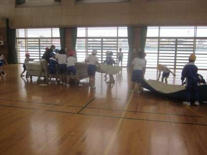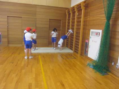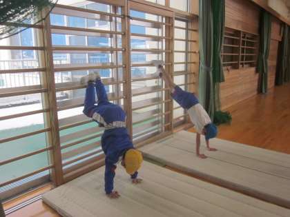 マットをよく見て、肋木に足をかけながら倒立しました。