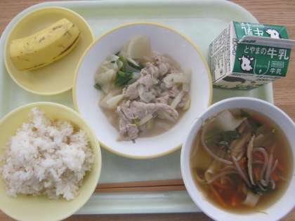 今日の献立は「麦ご飯(塩だれ豚丼)、牛乳、かぶの彩り、ワンタンスープ、バナナ」でした。