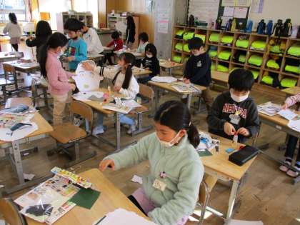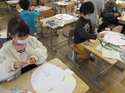 紙版画の版を作っています。画用紙や凹凸のある紙を使って、顔を作りました。どんな紙を使おうか、どんな表情にしようか工夫しながら作っています。でき上がったら刷るのが楽しみです。