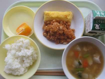 今日の献立は「ご飯、牛乳、卵ロール、白いんげん豆のトマト味、野菜のスープ煮、かんぺい」でした。