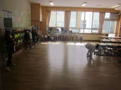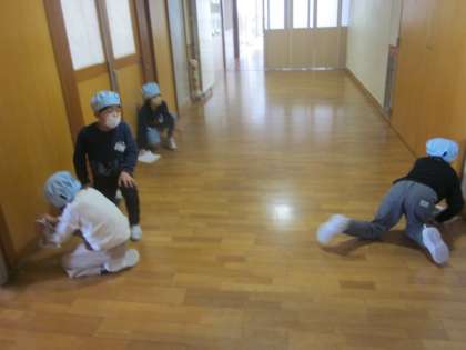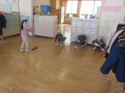 1年生の様子です。向きをそろえて、間隔をとってぞうきんがけをしてます。