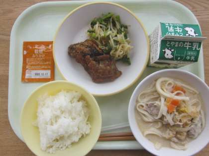 今日の献立は「ご飯、牛乳、魚の竜田揚げ、菜花びたし、白ごま豆乳うどん、穀物ふりかけ」でsた。