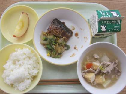 今日の献立は「ご飯、牛乳、鯖の照り焼き、チンゲンサイソテー、豚汁、りんご」でした。