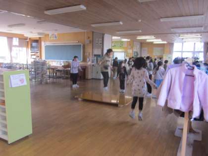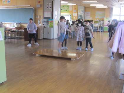 2年生です。休み時間にジャンピングボードを使って二重跳びの練習をしています。