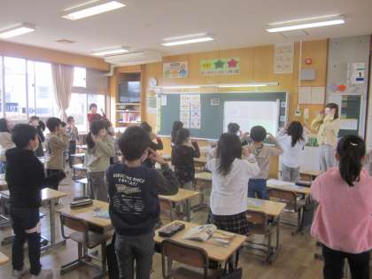 音楽に合わせて、「頭、肩、膝、つま先」を英語で歌いました。どんな歌だったのでしょうか、お子さんに聞いてみてください。