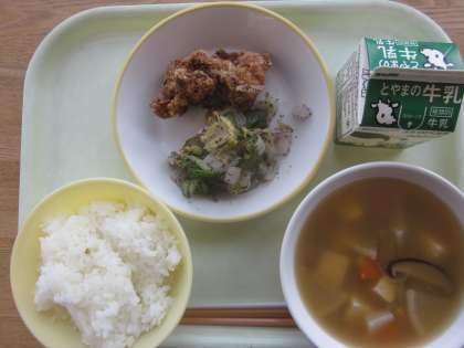 今日の献立は「ご飯、牛乳、鶏の竜田揚げ、ゆかり和え、けんちん汁」でした。