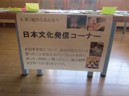 国語科の学習のまとめで作成したパンフレットです。6年1組からの発信です。2組の仲間は興味深そうに読んでいました。