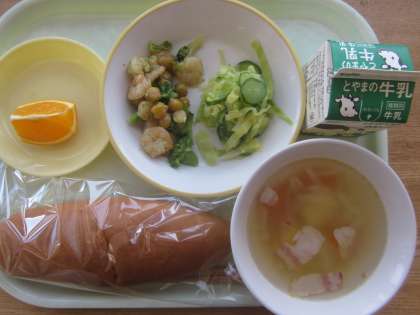 今日の献立は「米粉コッペパン、牛乳、エビとひよこ豆のオリーブオイル炒め、添え野菜、ポテトスープ、きよみオレンジ」でした。