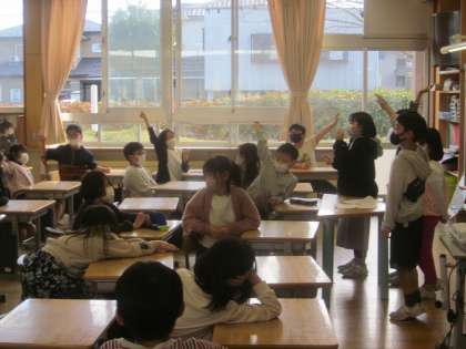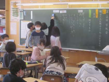 明日の大広田っ子タイムで何をするか学級会で決めています。子供たちが進行しています。