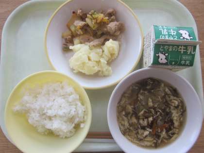 今日の献立は「ご飯、牛乳、豚肉のキムチ炒め、チーズポテト、卵ともずくのスープ」でした。