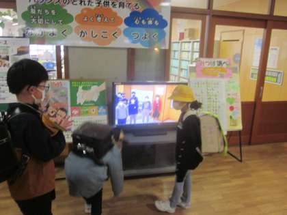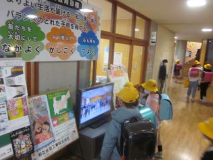 登校した子供たちが食い入るように見ていました。