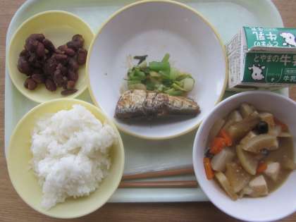 今日の献立は「ご飯、牛乳、鶏肉と根菜のごま煮、いわしの生姜味、煮豆、昆布和え」でした。