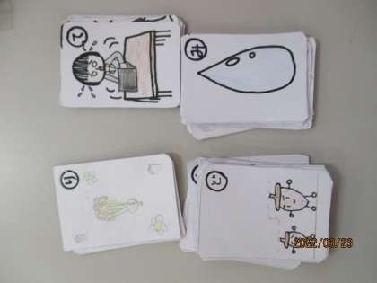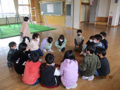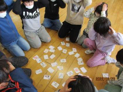 4年生最後の集会でドッジボールやかるた等行いました。かるたは子供の手作りで、みんなで楽しく遊びました。