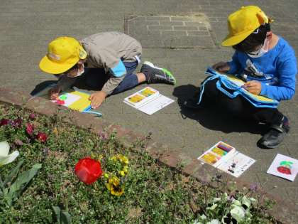 図画工作科の「お花見スケッチ」の学習で、春の花や昆虫を見付けて絵を描きました。子供たちは、チューリップや桜の木を見付けて春を感じながら、大喜びな様子で絵を描いていました。