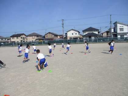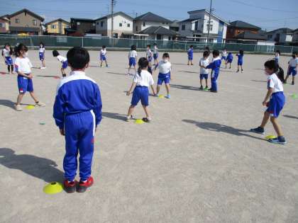 「チーズ」という遊びでは、5人が5つのコーンに分かれ、先生の「チーズ」のかけ声で他の場所に走って移ります。子供たちは、しっかりと先生の話を聞いて、反応よく走り出していました。
