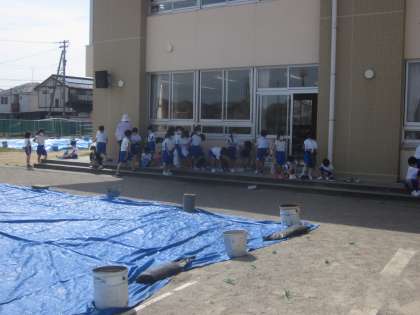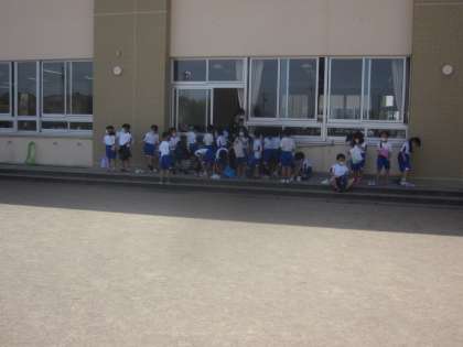 グラウンドで体育科の授業を初めて行いました。写真は終わった後の様子です。ズックを自分のフックにしっかりとかけました。