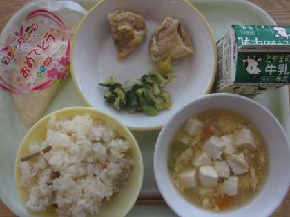 今日の献立は「ちらし寿司、鶏肉の唐揚げ、チンゲンサイひたし、かき玉汁、お祝いデザート(いちごクレープ)」でした。