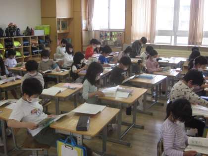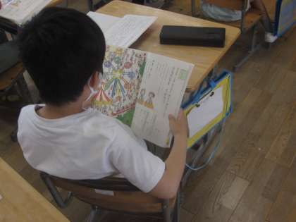 説明を聴いて、国語の教科書のどこかにいる友達を探しています。