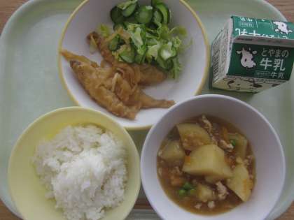 今日の献立は「ご飯、牛乳、ワカサギの南蛮漬け、きざみ和え、じゃがいものそぼろ煮」でした。