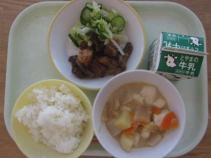 今日の給食は「ご飯、牛乳、豚肉とレバーの揚げからめ、きざみ和え、胡麻けんちん」でした。