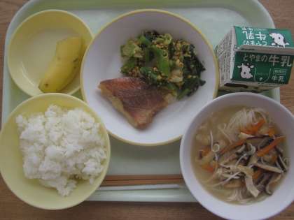 今日の献立は「ご飯、牛乳、赤魚の塩焼き、炒り大豆和え、にゅうめん、バナナ」でした。