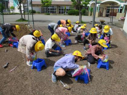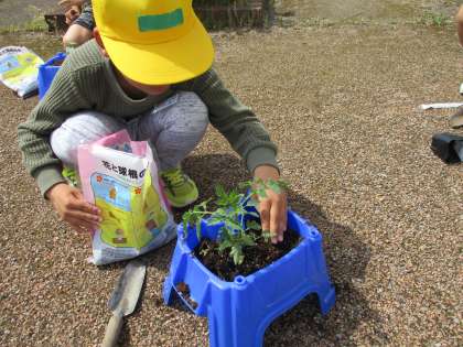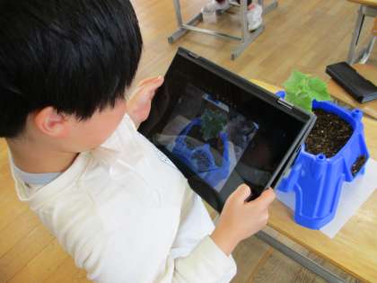 生活科の学習で、野菜の苗を植えたり、観察をしたりしました。苗に土を被せながら「早く、大きくなってね。」「野菜を早く食べたいな。」と真心を込めて苗を植えました。また、観察では、クロームブックで写真を撮ったり、じっくりと見たり触ったりしながら、苗の細かなところまで絵や文で表しました。