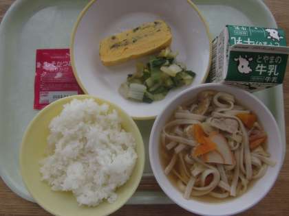 今日の献立は「ご飯、牛乳、かやくうどん、エゴマ入り卵焼き、おひたし、しそ鰹ふりかけ」でした。