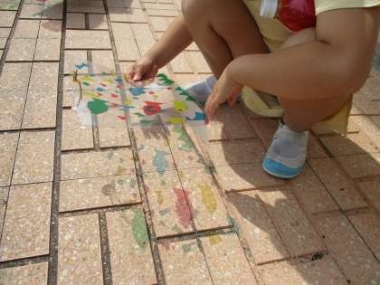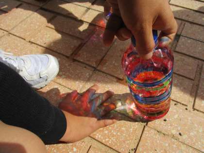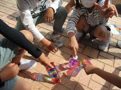 図画工作科の「ひかりのプレゼント」の学習では、透明なペットボトルに油性マジックで色を塗り、光に当ててみました。「かげは、黒色だけかとおもっていたけど、色がついてきれいだな。」と新しい気付きがありました。
