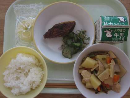今日の献立は「ご飯、牛乳、魚の米粉揚げ、ゆかり和え、筑前炊き、冷凍パイン」でした。