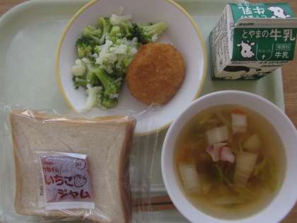 今日の給食は「食パン、牛乳、コロッケ、花野菜サラダ、ひよこ豆のスープ、イチゴジャム」でした。
