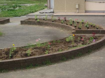 各学級ごとに花壇に花苗を植えています。 写真は1・3年生の花壇です。