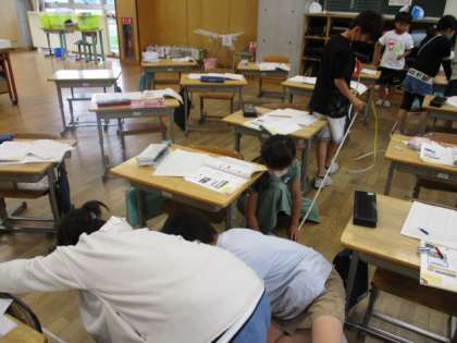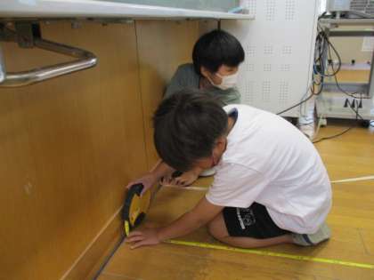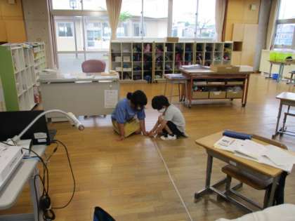 巻き尺を使って、教室の縦や横の長い長さをはかりました。