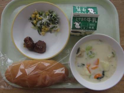 今日の献立は「コッペパン、牛乳、ミートボール、水菜のサラダ、ホタテのクリーム煮」でした。